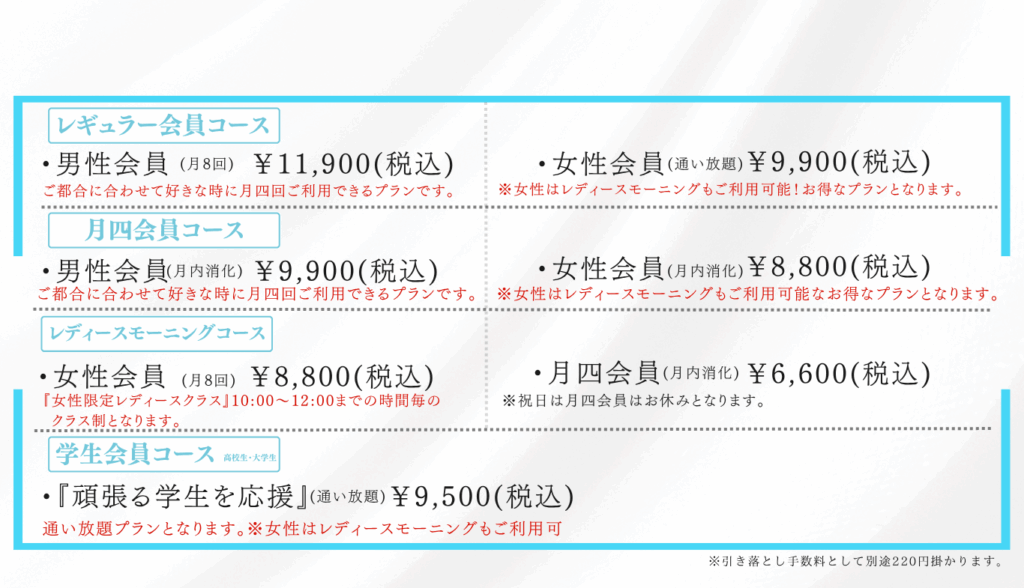 ジム会則及び諸規定守れない方、妊娠中の方、医師に運動を制限されている方、暴力団または反社会的な組織の関係者の方、人を威圧する行動、言動をする方は入会をお断りしております。