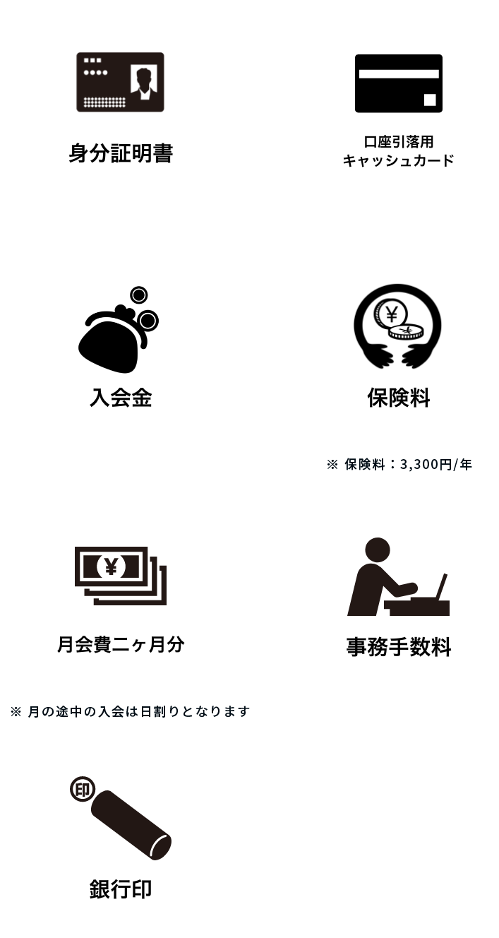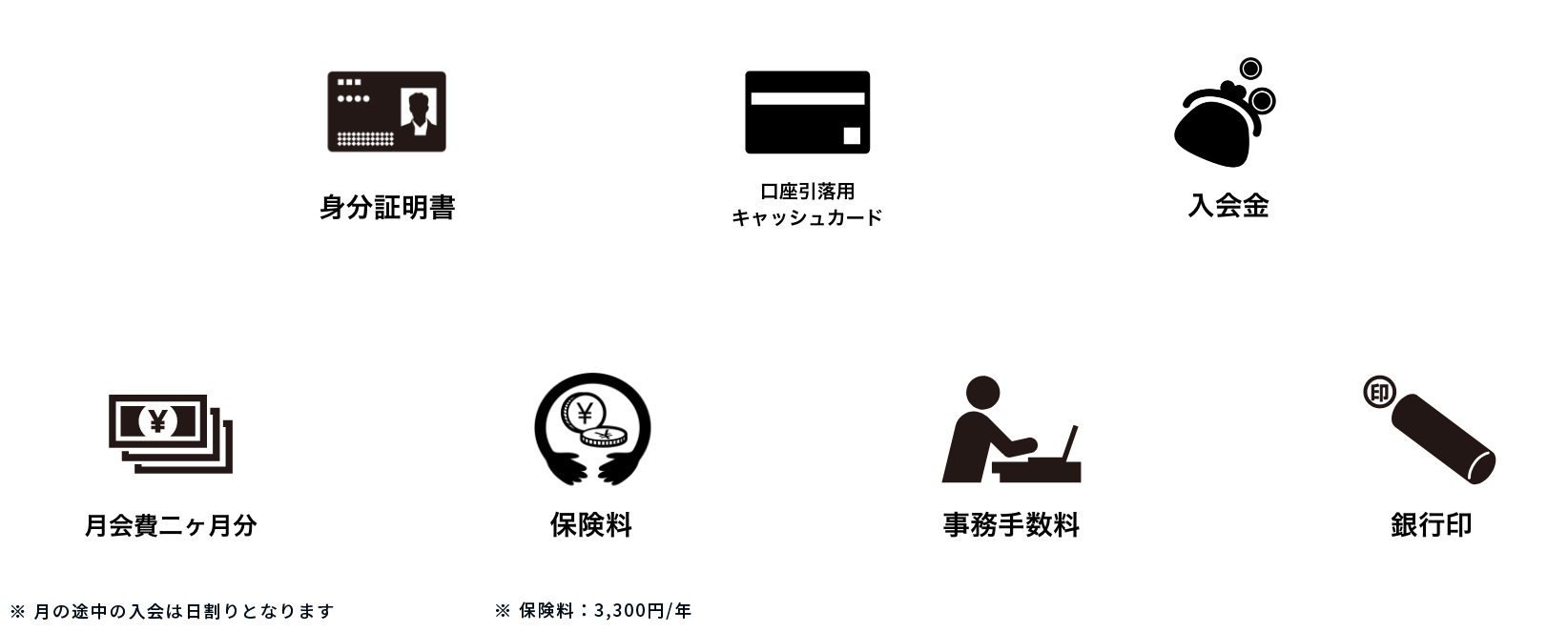 【1】月会費2ヶ月分の現金(月の途中入会の場合は日割り)